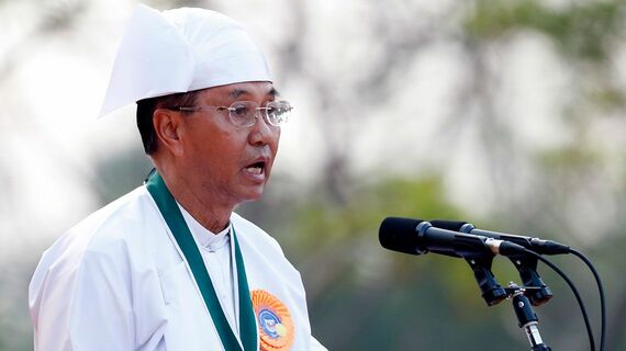 独立記念日で演説するミャンマー副大統領ミンスエ氏(写真:アフロ)