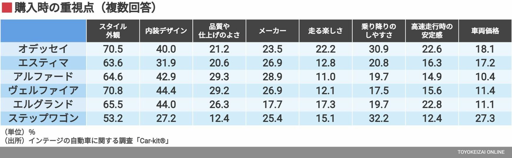 続いて「購入時の重視点」を見ていこう。オデッセイで重視されているのは、「スタイル・外観」「内装デザイン」「走る楽しさ」「乗り降りのしやすさ」「高速走行時の安定感」となっている。