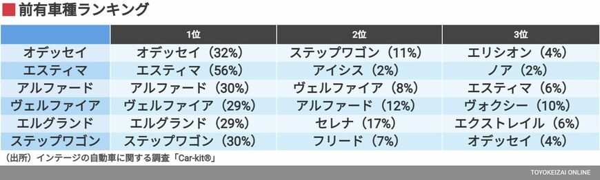 トヨタのエスティマはトヨタからの乗り換え率が84%、日産のエルグランドも日産からの乗り換えが72%となっている中で、オデッセイはホンダからの乗り換えが68%と、同一メーカーからの継続購入率がやや低い。次に前有車の車種についても見てみよう。