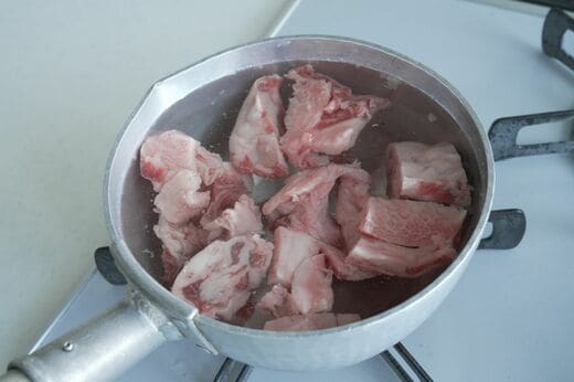 この調理操作は現代においては絶対に必要というわけではありません。その目的は<表面の臭みを取り除くこと>ですから、そもそも臭みが少ない肉の場合は省略できるのです。購入してきた牛すじパックを開けて臭いをかぎ、判断しましょう。