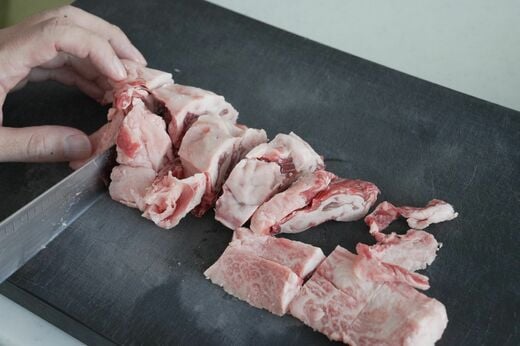 牛すじは長さ2cmに切っておきます。包丁が切れない場合は切るのに苦労するかもしれません。その場合は2〜3分ほど下ゆでしてから水にとって冷やすと、切りやすくなります。