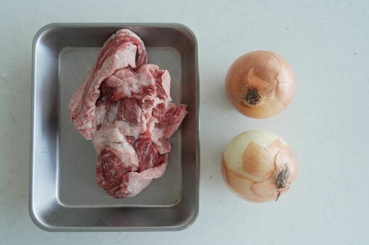 牛すじ肉はパックを見て、ドリップが出ていないものを選びましょう。玉ねぎはものによって大きさが違うので調整してください。