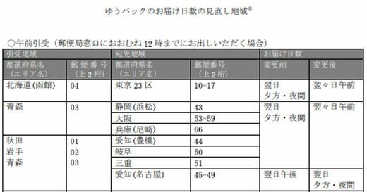 まず(1)だが、たとえば、東京23区で荷物を出す。宛先は北海道の函館エリアとする。変更前は翌日の夕方・夜間に到着。それが変更後は、翌々日の午前中になる。