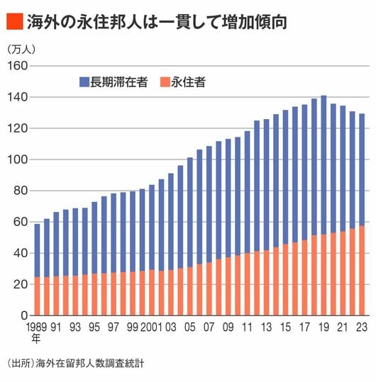 海外長期滞在者と永住者を合計した海外在留邦人の数は右肩上がりに増え続け、コロナ直前の2019年にピークをつけた。その後減少するのは、やはりコロナの影響が大きかったのかもしれない。