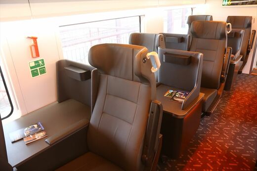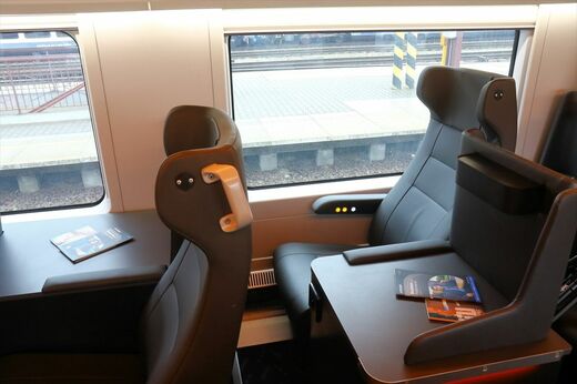 リクライニングは電動式で、傾斜角度はそれほど大きくはないが、ただ背面が倒れるだけではなく座面も適度に後方へ下がるため、お尻がホールドされ非常に掛け心地は良い。また、フットレストではなくレッグレストが装備されている点も注目で、これは現在運行されているヨーロッパ内の多くの列車でもあまり見かけない。互い違いの1列シート以外にも、グループ向けに対面となっている座席もあり、さまざまな工夫が見られる。