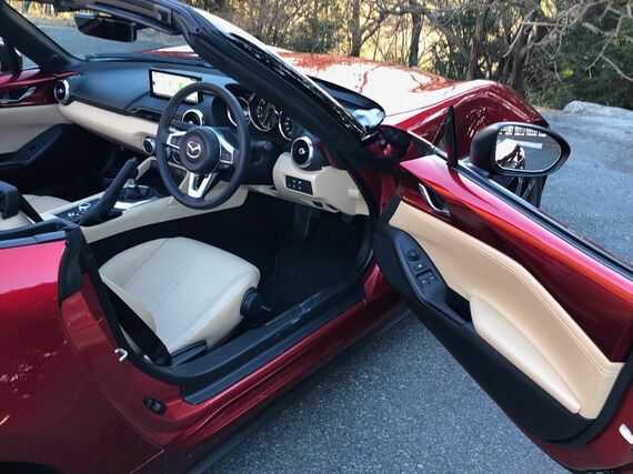 マツダ関係者との意見交換の後、ソフトトップのSレザーパッケージ Vセレクションに乗って、技術やデザイン領域の大幅改良箇所を再確認しながら、ロードスターを楽しんだ。
