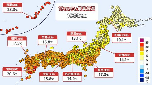 この時期としては高い気温で、東京は17.3℃、宮崎は20.6℃まで上がり、4月並み。関東から西日本では15℃以上のところが多く、昼間は厚手のコートがなくても過ごせました。