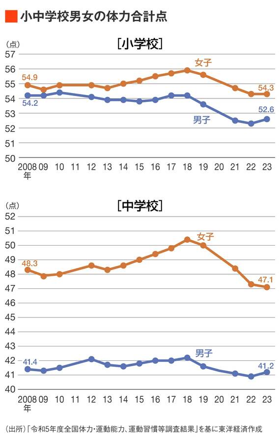 まずはスポーツ庁による「令和5年度全国体力・運動能力、運動習慣等調査結果」の図を見てみよう。体力合計点はコロナ禍で大きく下降しているが、特筆すべきは、その前の2018年度時点で、すでに明らかな低下がみられる点だ。