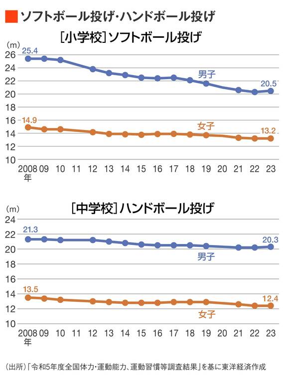 2017年に部活動についてのガイドラインが出されたことも影響しているかもしれないが、これでは小学生も同様に低下していることは説明できない。また「ソフトボール/ハンドボール投げ」のグラフを見ると、数値はじわじわと下がり続けており、とくに小学生男子では顕著だ。