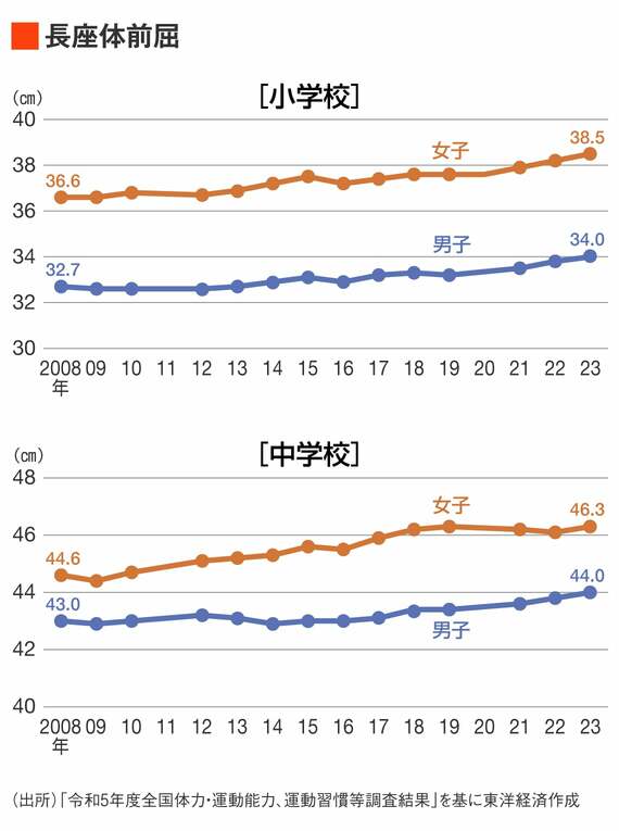 だが、一方で柔軟性を測る長座体前屈の結果のみを取り出してみれば、こちらは小中学校男女問わず、ゆっくりながらほぼ上昇を続けているという好結果だ。