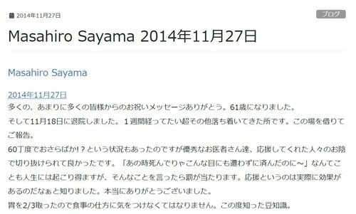 医師からは長年の不摂生が原因ではないかと指摘された。以降は禁煙禁酒し、小さくなった胃に負担をかけないような生活を心がける。その暮らしと抗がん剤治療が奏功し、少しずつ元来の精力的なライフスタイルを取り戻していった。入院時は「60丁度でおさらばか!?」との考えもよぎったが、徐々に死は遠のいていく。