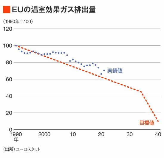 欧州連合(EU)の執行部局である欧州委員会は2月6日、二酸化炭素(CO2)に代表される温室効果ガスの排出削減目標を、2040年までに1990年比で90%減とすると発表した。EUは、いわゆる「パリ協定」に基づき、2050年までに温室効果ガスの排出量を実質ゼロ(排出量と吸収量が等しくなること)にすることを目指している。