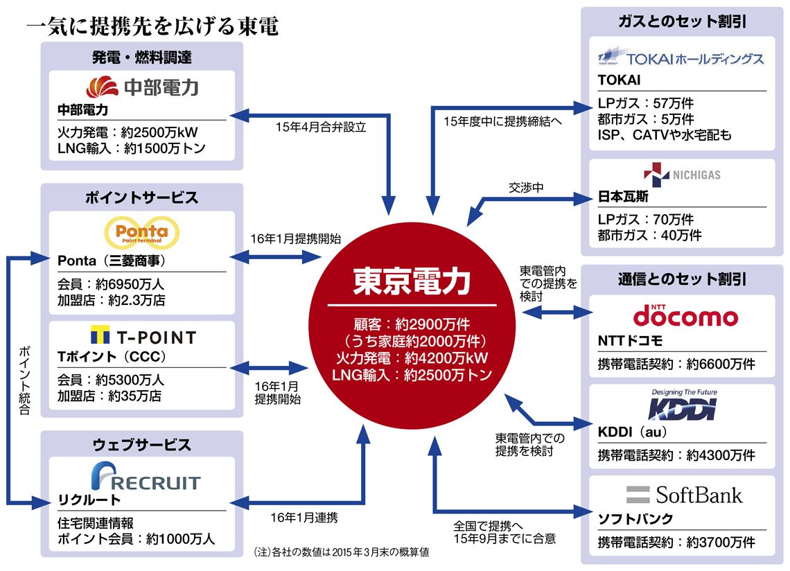 家庭など低圧分野への新規参入が解禁され、電力小売り全面自由化が実現する2016年4月まで1年を切り、攻守のカギとなる提携戦略の動きが慌ただしい。先行しているのは、福島第一原子力発電所事故の巨額賠償責任で実質経営破綻し、公的管理下にある東京電力だ。