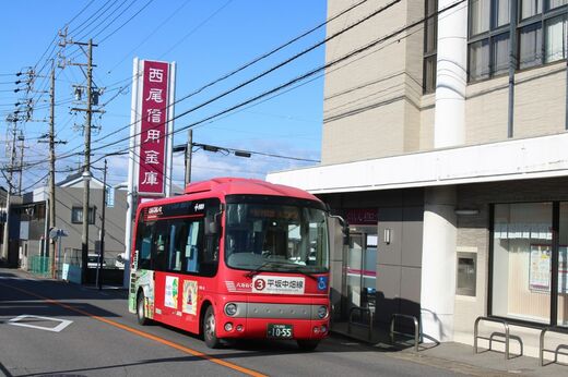一色高等学校西バス停を過ぎ、旧一色町の中心部に入る。幹線道路から脇道にそれた一色町公民館バス停が、バスターミナルの機能を果たしている。