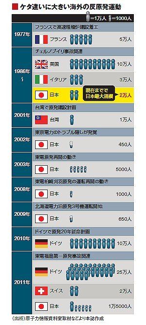 とはいえ福島第一原発事故後、ドイツでは25万人規模のデモ(表)が起こるなど海外の反原発運動はケタ違いだ。日本は当事国でありながら関心の低さが否めない。福島の事故前は、反原発デモの規模は数百人から数千人がせいぜい。国策である原発を前に反対派の声はかき消され続けてきた。
