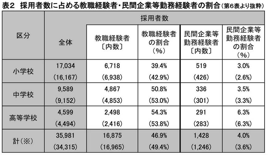 注1:「計(※)」は小学校、中学校、高等学校、特別支援学校、養護教諭、栄養教諭の合計 。注2:「教職経験者」とは、公立学校教員採用前の職として国公私立学校の教員であった者をいう。注3:「民間企業等勤務経験者」とは、公立学校教員採用前の職として教職以外の継続的な雇用に係る勤務経験のあった者をいう (ただし、いわゆるアルバイトの経験は除く)。注4:( )内は、前年度の数値。
