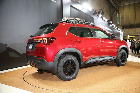 そんなWR-Vをベースにした展示車両は、純正アクセサリーを用いたエクステリアコーディネートの「タフスタイル」をベースに、各部をショー用にモディファイしている。タフスタイルとは、WR-Vの外観をよりアクティブに演出するために、デザインに統一感を持たせた純正アクセサリー群の総称。縦基調の造形を持つフロントグリルや、ヘビーデューティな雰囲気を持つ前後左右のロアガーニッシュ、フロントバンパーの左右に装着するフォグライトガーニッシュなどを擁する。