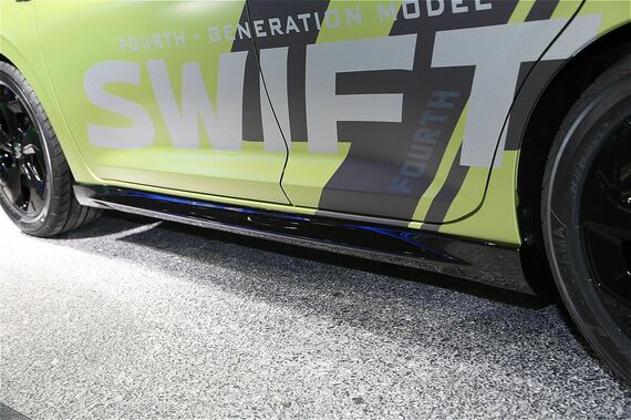 そんな新型スイフトが持つスポーティな外観をより強調しているのが、今回の展示車両だ。主なカスタマイズは、新型に新設定された車体カラー「クールイエローメタリック」をベースに、マット(ツヤ消し)仕上げにした専用カラーを施していること。
