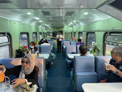 6時50分ごろ、新たに高架駅となったドンムアン空港駅に到着するあたりでようやく明るくなってきたので食堂車へ向かう。