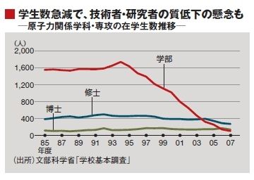 文部科学省の調べでは、「原子力」の名を冠する学科、研究科の在学生数は減少。2007年度の学部生は全国でわずか100人と、ピークだった94年度の17分の1にまで急減している。