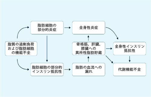 全身性炎症と異所性脂肪はそれぞれ、全身性インスリン抵抗性を引き起こし、そのせいで代謝が機能不全に陥る。