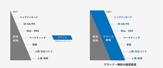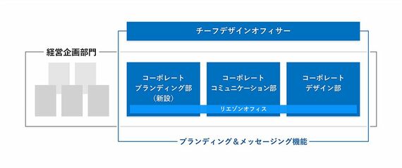 「無形の経営資源」であるブランドの価値を向上させるためにまず取り組んだのが、経営戦略とブランド戦略を密接に連携できる組織づくりです。その一環として、2022年にコーポレートブランディング部を新設し、コーポレートコミュニケーション部・コーポレートデザイン部とともに、経営企画部門の中に位置づけました。この3つの部を「ブランディング&メッセージング機能」とし、チーフデザインオフィサーである私が統括しています。