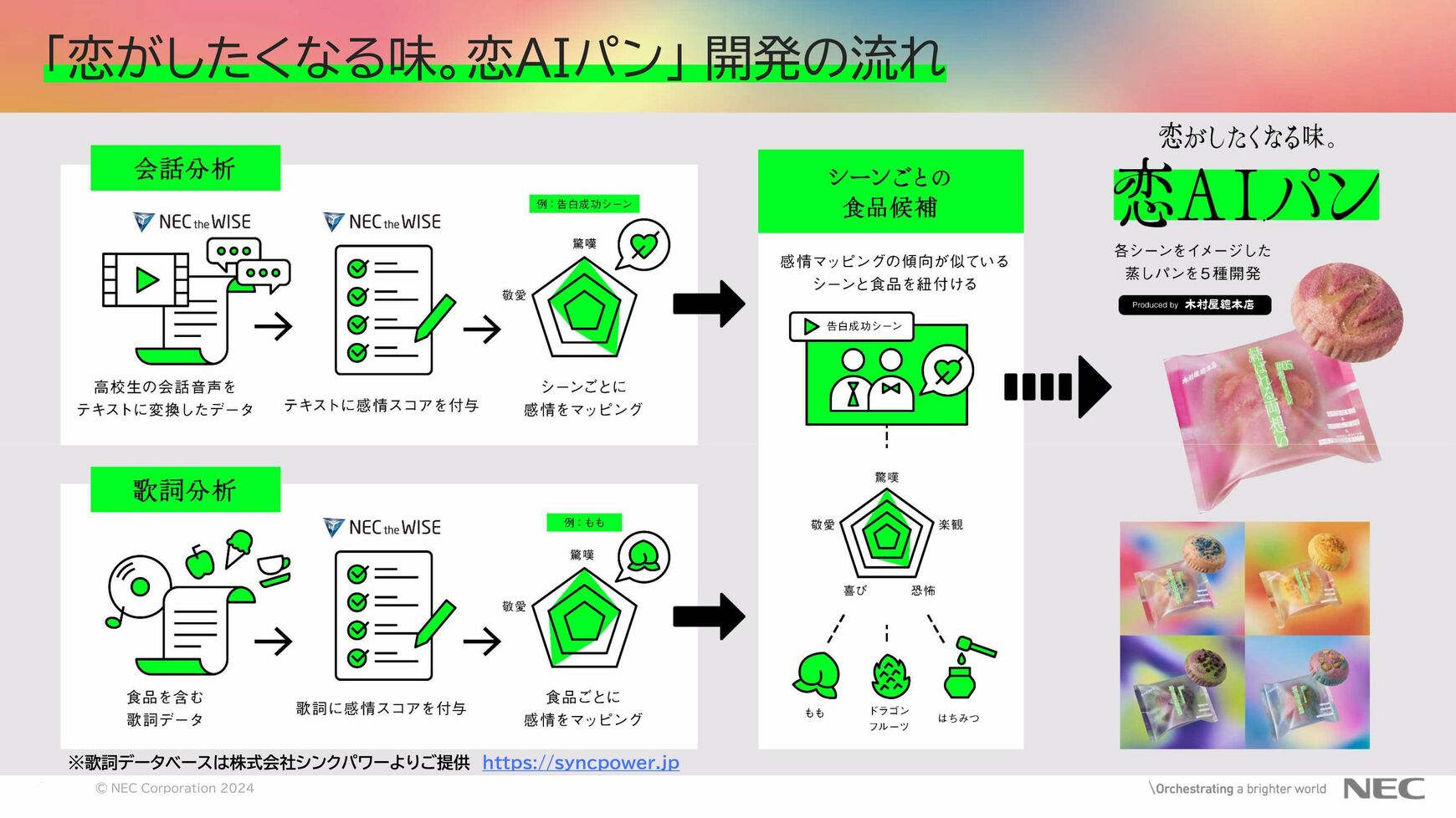 吉崎 例えば、一口に「出会い」と言っても、喜び、緊張、不安など、そこにはさまざまな感情が含まれています。NECは、音声認識、データ意味理解技術などのAIを活用し、若い人たちに人気の恋愛番組の会話と約100万曲の日本語の歌詞を分析。恋愛の象徴的なシーンを構成する複雑な感情と、その感情を味として表現するのに適した食材をリスト化しました。木村屋總本店(以下、木村屋)さんがそのリストを基にパンのレシピを開発し、5種類の味の恋AIパンが誕生しました。