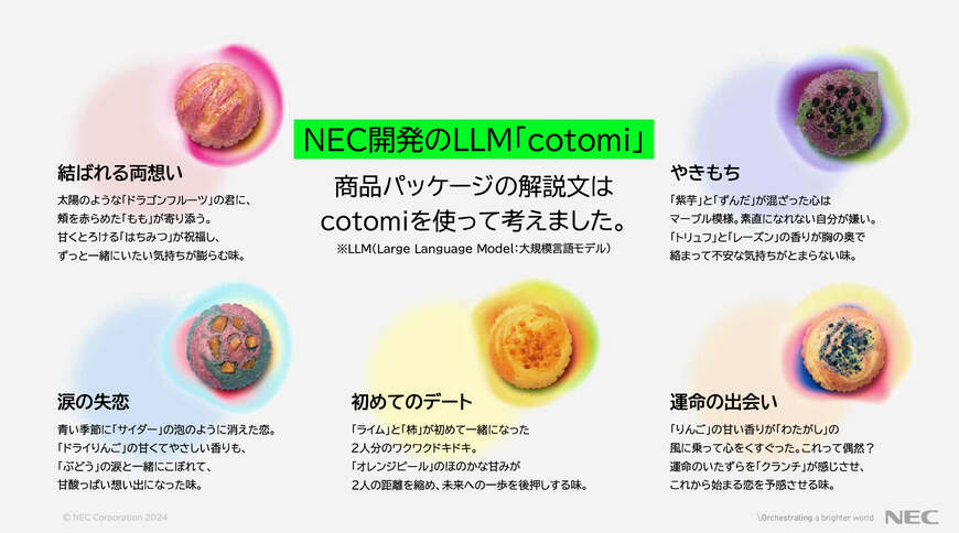吉崎 今回、NECは先ほど紹介した食材リストの作成以外にも、もう1つAIに関する挑戦を行いました。昨年から話題の生成AIの実用化です。NEC開発のLLM(Large Language Model:大規模言語モデル)「cotomi」を利用して、恋AIパンの商品パッケージやWebサイトなどで使用している商品解説文を生成しました。自社の技術ではありますが、AIが生成したフレーズを見て私はとても感動しました。