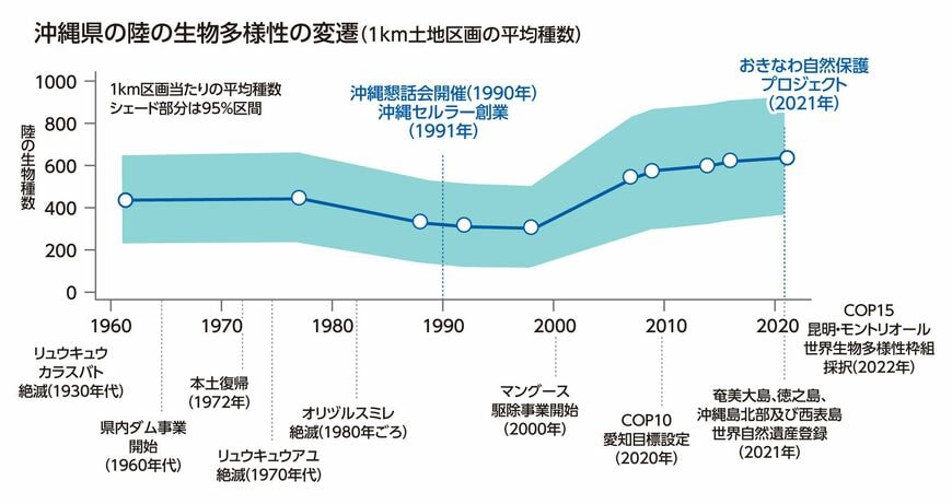 沖縄では戦中戦後に自然環境が荒廃し、1972年の返還後も、経済成長に向けた開発が進められ、90年代中頃まで生物多様性の豊かさが減っていきました。