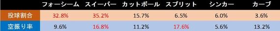 下の表のように、投球割合はフォーシームとスイーパーが高く、空振りを多く取れている球種はスイーパーとスプリットが高い結果になっています。