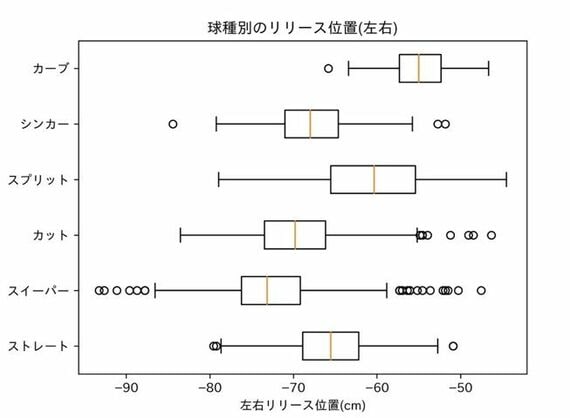 以下のグラフは、大谷選手の球種ごとのリリースポイントの左右位置を示した箱ひげ図です。