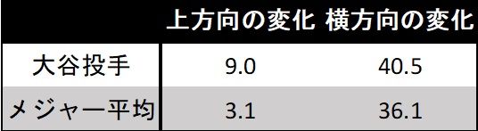 実際のデータでも、この独特な軌道を確認することができます。2023年メジャーリーグ全体のスイーパーの変化量平均は、上方向に3.1cm、横方向に36.1cmでした。一方、大谷選手のスイーパーをみると、上方向に9.0cm、横方向に40.5cmとなっています。