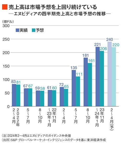 市場予想を下回れば株式市場全体に冷や水を浴びせかねない状況だった。だが、2023年11月〜2024年1月の売上高は221億ドルで着地。2024年2~4月は240億ドルを見込むと発表した。それぞれ市場予想を大幅に上回る数字だ。
