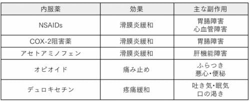 この疾患は、次の図表に示すような対症療法的に用いられることがあります。しかし、残念ながらこれらの薬剤はあくまで疼痛緩和などの対症療法であって、治療や予防ができるものではありません。