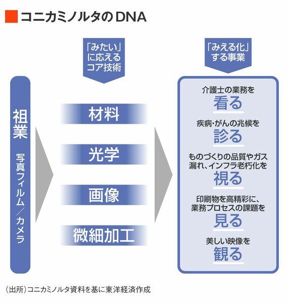 もともとコア技術として、材料、光学、画像、微細加工がありました。写真やカメラからスタートしている技術です。今はいろいろな画像を使ったソリューションに携わっていますが、これを言葉にすると、いろいろな「みたい」に応える存在となります。看たい、診たい、視たい、見たい、観たい。