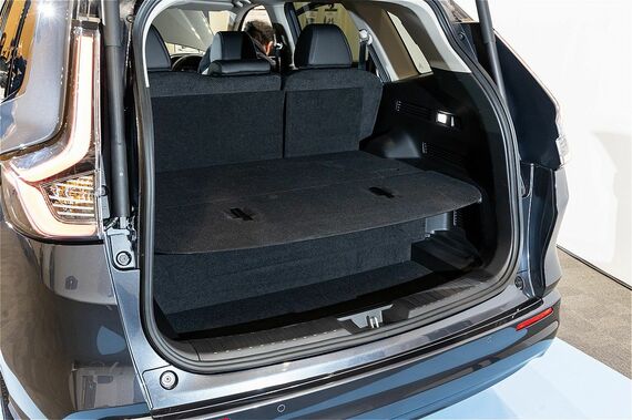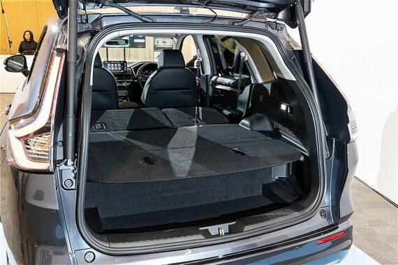 また、リアシートは6:4分割で可倒式になり、シートを倒すことでフラットな荷室も作れるので長尺物も積みやすい。ちなみにフレキシブルボードは、かなり頑丈に作られているそうで、上段に設置すれば簡易ベッドとしても使えそうな雰囲気だった。後述するが、CR-V e:FCEVは給電も可能なので、最近流行りの車中泊仕様としても面白いベース車に感じた。後席を倒し、フレキシブルボードを上段に取り付ければ、比較的フラットなベッドキットのような形状になり、SUVながら大人が十分に横になれるスペースが生まれるし、下段に荷物も収納できて便利そうだ。