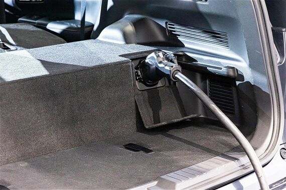 この外部給電口は、プラグイン充電機能に加え、最大1500WのAC給電も可能。プラグイン充電については、日本およびアメリカにおける普通充電規格「SAE J1772」に対応し、自宅のACコンセントに接続することで手軽に車両の充電が可能だ。