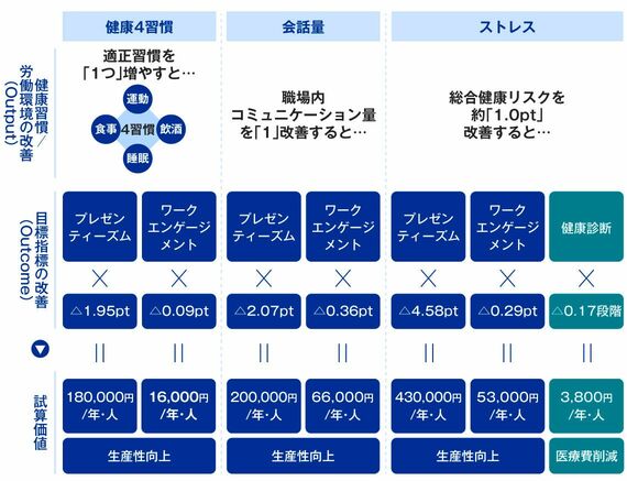 「プログラムにはチームでポイントを競う機能を取り入れました。それをネタに職場での会話が増えたのかもしれません。今回のPoCでは、会話量が1ポイント改善すると、プレゼンティーズムが2ポイント、ワークエンゲージメントが約0.3ポイント改善しました。これを生産性向上に換算すると、1人当たり年間約20万円です。これを可視化できた意義は大きいです」
