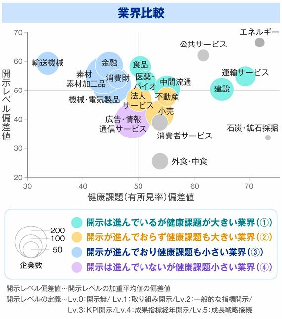 「業界によっても温度差があります。輸送機械や金融業界は従業員の有所見率が低いうえに開示レベルも高いのですが、公共サービスやエネルギー、建設業界は有所見率が高く、それを課題として認識しているがゆえに健康経営に積極的です。反対に外食・中食業界や小売業界は健康課題が大きく、かつ開示が遅れている企業が多い。健康経営を進める際には、業界の特徴や自社の課題を踏まえて取り組むべきでしょう」(菅氏)