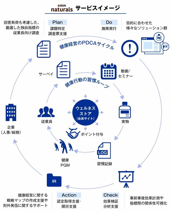 PoCで一定の効果を確認できた「KIRIN naturals」。今後は健康習慣改善プログラムや効果検証サーベイもソリューションのメニューに加えて、健康経営に取り組む企業に提供していく考えだ。