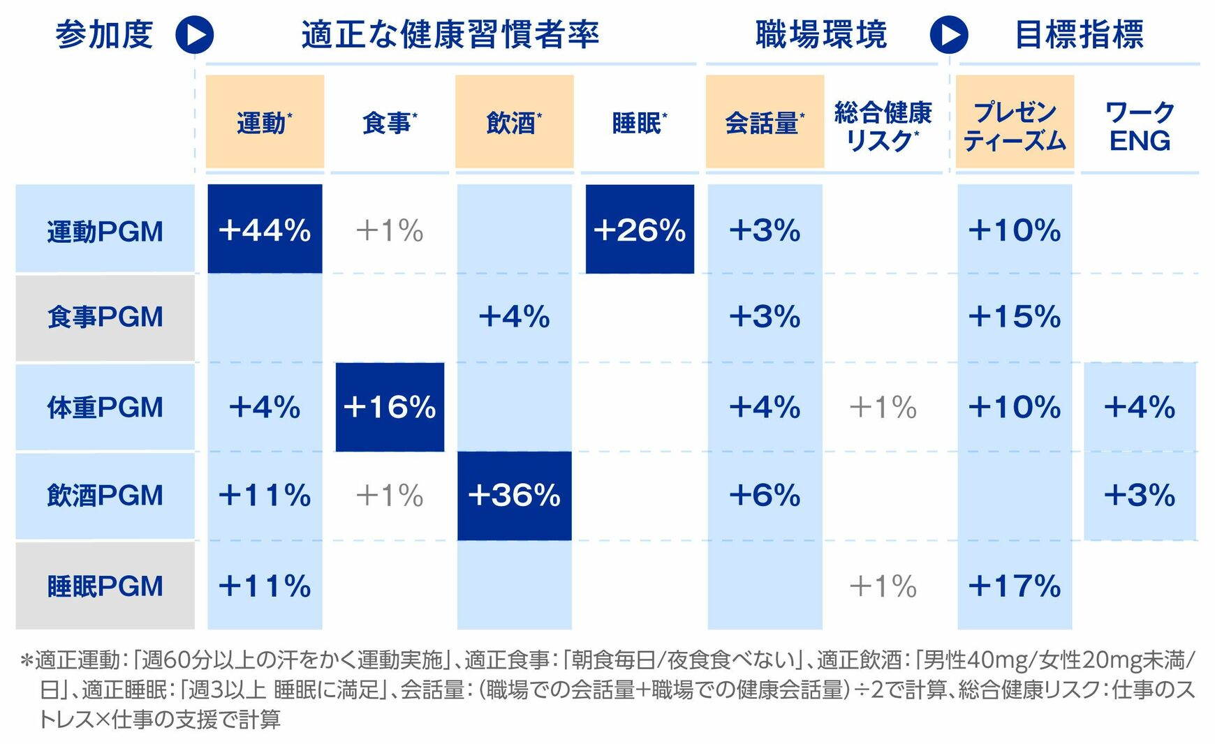 PoCでは、5テーマ(運動・食事・体重・飲酒・睡眠)でプログラムを実施。各プログラム参加者はそれぞれ健康習慣に改善効果が見られたが、運動プログラムは44%、飲酒プログラムは36%と、とくに改善効果が目立った。また、興味深い結果も出た。プログラム参加者は職場内の会話量が増え、それがプレゼンティーズムやワークエンゲージメントの改善にもつながっていることがわかったのだ。キリンビバレッジの高橋正浩氏はこう話す。