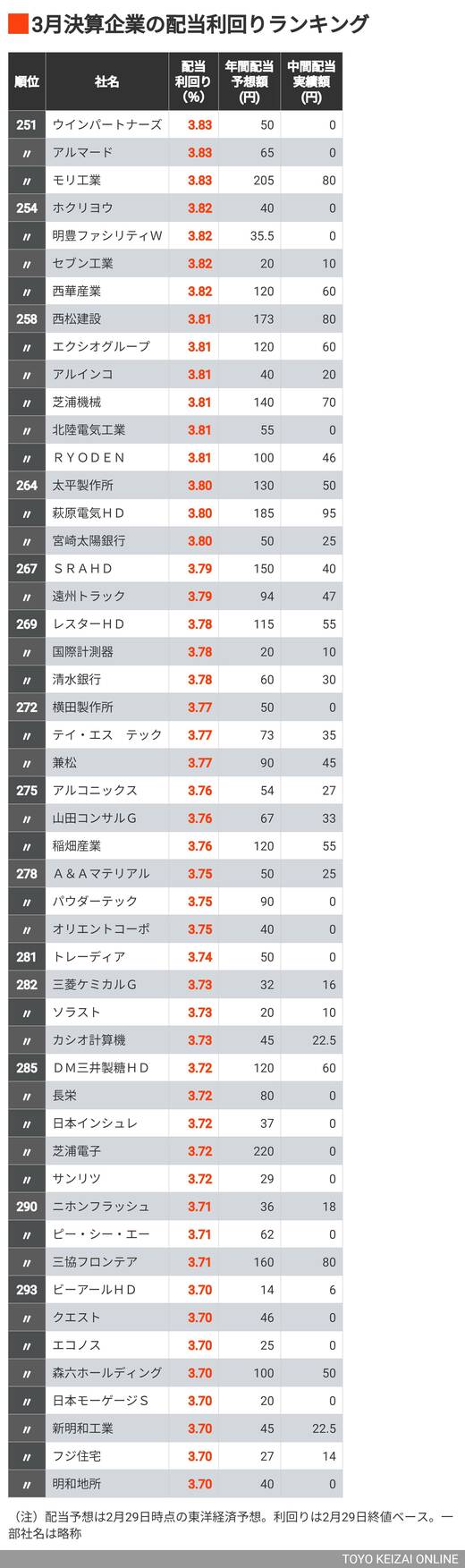 政治・経済・投資 「4%超えが185社」3月決算の配当利回りトップ300 5%以上は13社、大幅増配の発表で株価急騰も 2分で読める 公開日時:2024/03/01 17:30 東洋経済オンライン編集部 フォロー 1/7 PAGES 2/7 PAGES 3/7 PAGES 4/7 PAGES 5/7 PAGES 6/7 PAGES 7/7 PAGES 最後に251~293位
