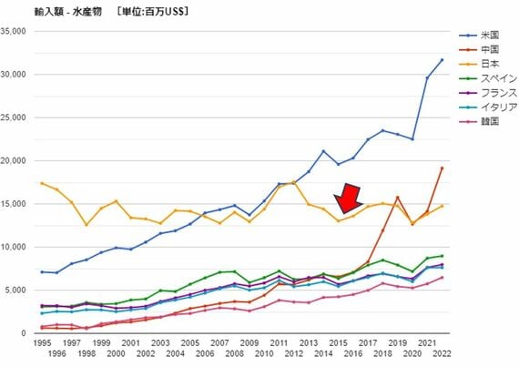 次の表は世界の水産物輸入金額を示しています。オレンジ色の折れ線(赤い矢印)グラフが日本です。2006年まで、日本は世界最大の水産物輸入国でした。現在では、EUを個々の国とした場合、アメリカ・中国に次ぐ第3位です。