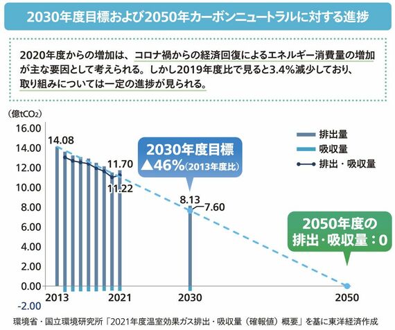高村 2021年度の日本の温室効果ガス排出量は、コロナ禍の影響で排出量が大幅に減少した20年度から若干リバウンドしています。30年ごろには13年度比で約40%削減に至るような速度で排出は減っていますが、13年度比46%削減、50%削減の高みを目指すという30年度目標達成にはさらなる対策の強化・加速がカギを握ります。