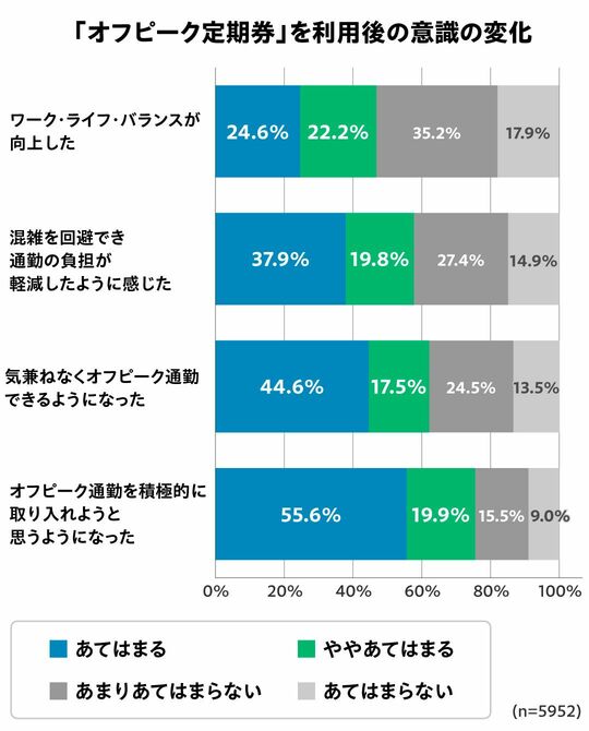 実際、JR東日本が実施した「オフピーク定期券」購入者アンケート調査によれば、利用後に「気兼ねなくオフピーク通勤できる」と回答した人は約62%(あてはまる・ややあてはまるの合計)、「ワーク・ライフ・バランスが向上した」は約47%(同)を占めた。裏を返せば、今までは気兼ねしてオフピーク通勤ができず、ワーク・ライフ・バランスも十分には整っていなかったということだ。「オフピーク定期券」の導入は、そんな硬直化した状況を一変させるインパクトを持つことがわかる。