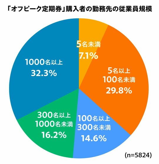 興味深いのは、「オフピーク定期券」を購入している社員が必ずしも大手のみではないということだ。前出のJR東日本が実施したアンケート調査によれば、最も多いのは1000名以上(32.3%)だが、次いで多いのは5名以上100名未満(29.8%)。100名以上300名未満(14.6%)と5名未満(7.1%)を加えれば、比較的小規模な企業が51.5%と半数以上を占めている。