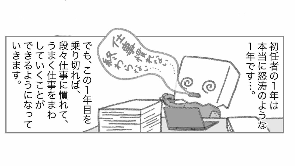 初任者の1年は本当に怒涛のような1年です。でも、この1年目を乗り切れば、段々仕事に慣れて、うまく仕事をまわしていくことができるようになっていきます。