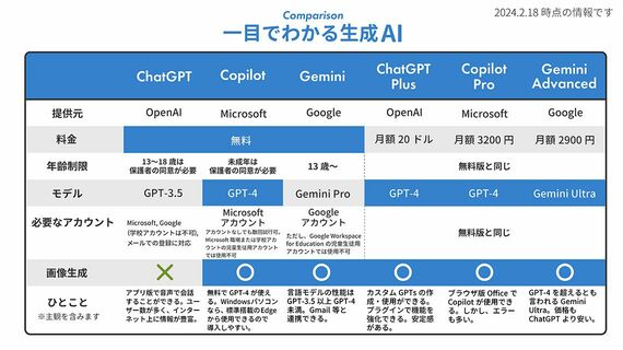 ただし、今後、各生成AIが児童生徒用アカウントでのサインインに対応すれば選択肢は広がります。Google Workspace for Educationを使用している学校はGoogleのアカウントがあるので、Geminiも選択肢に入ってくるでしょう。