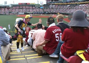 一方、カリスマ売り子の佐藤さん。とりわけ声を張り上げることもなく、何かを探すように客席に目をやった。彼女の目的は常連さん。実は試合が始まるとすべての売り子は販売エリアを固定されてしまうため、試合開始前はエリア外に座っている常連さんを探す時間にあてるのだ。そうして「見つけた~!」などと歓喜の声をあげながら常連客のところへ小走りで向かい、最初の1杯を買ってもらう。