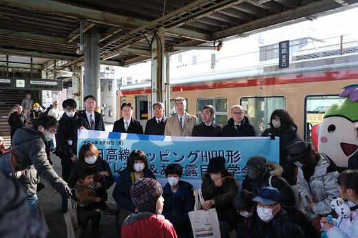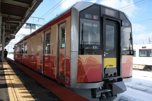 9時15分ごろ、苫小牧駅の1番線ホームにH100形のラッピング車両が入ってきた。プレ運行に使用された日高本線ラッピング車両は国鉄一般気動車標準色をベースに、胆振地域を象徴する馬や恐竜のイラストが描かれている。到着後に記念撮影が行われ、各市町の首長と抽選で選ばれた25人の乗客が車両に乗り込んだ。プレ乗車は苫小牧市が沿線市町在住者や通勤通学者を対象に募集し、市の担当者によると締切日の2月6日までに97人の応募があったという。定員25人の約4倍の応募があったことになり、広報活動は一定の成功を収めたと言える。